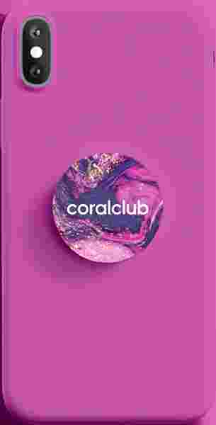 Laikiklis „PopSocket“ su Coral Club logotipu — sulankstomas plastikinis išmaniojo telefono laikiklis.